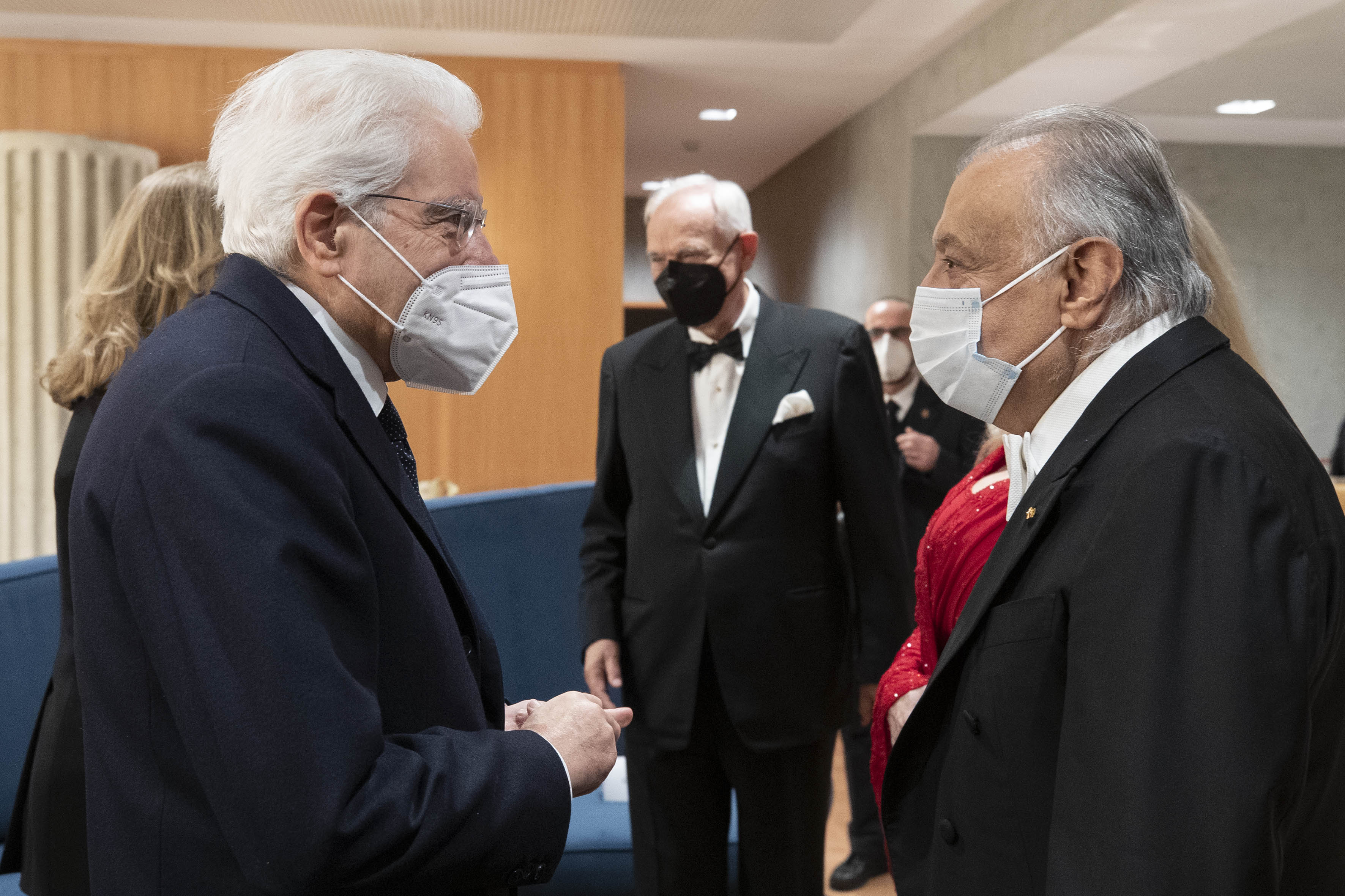 Il Presidente della Repubblica Sergio Mattarella saluta il Maestro Zubin Mehta, Direttore emerito a vita dell’Orchestra del Maggio Musicale Fiorentino,in occasione del concerto di inaugurazione dell’Auditorium
