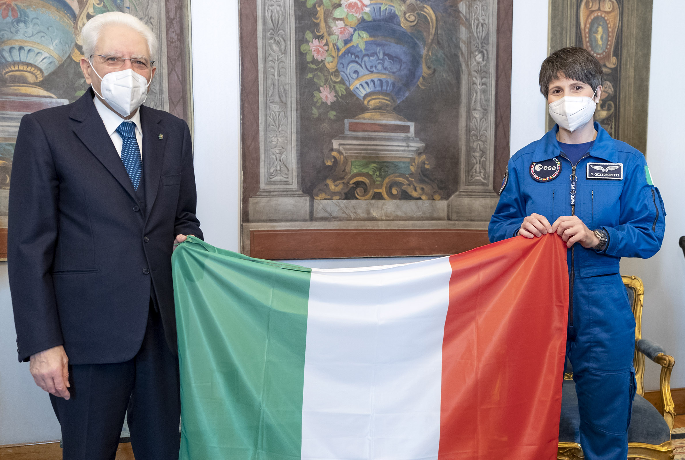 Il Presidente Sergio Mattarella consegna il Tricolore a Samantha Cristoforetti, in partenza per la Stazione Spaziale Internazionale