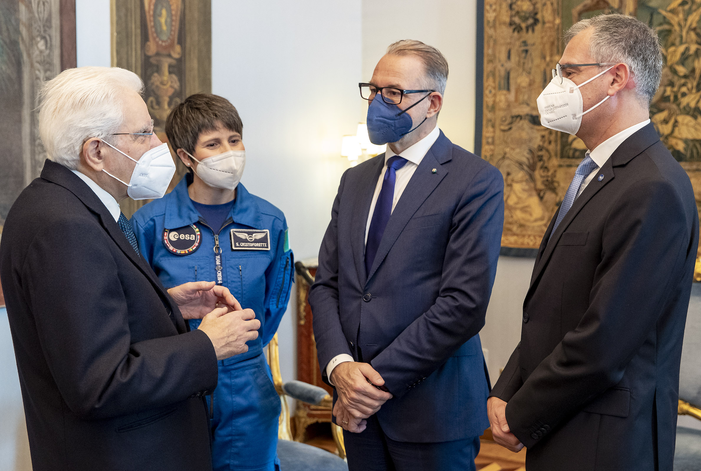 Il Presidente Sergio Mattarella con Samantha Cristoforetti, in partenza per la Stazione Spaziale Internazionale, Josef Aschbacher, Direttore Generale dell’Agenzia Spaziale Europea e Giorgio Saccoccia, Presidente dell’Agenzia Spaziale Italiana